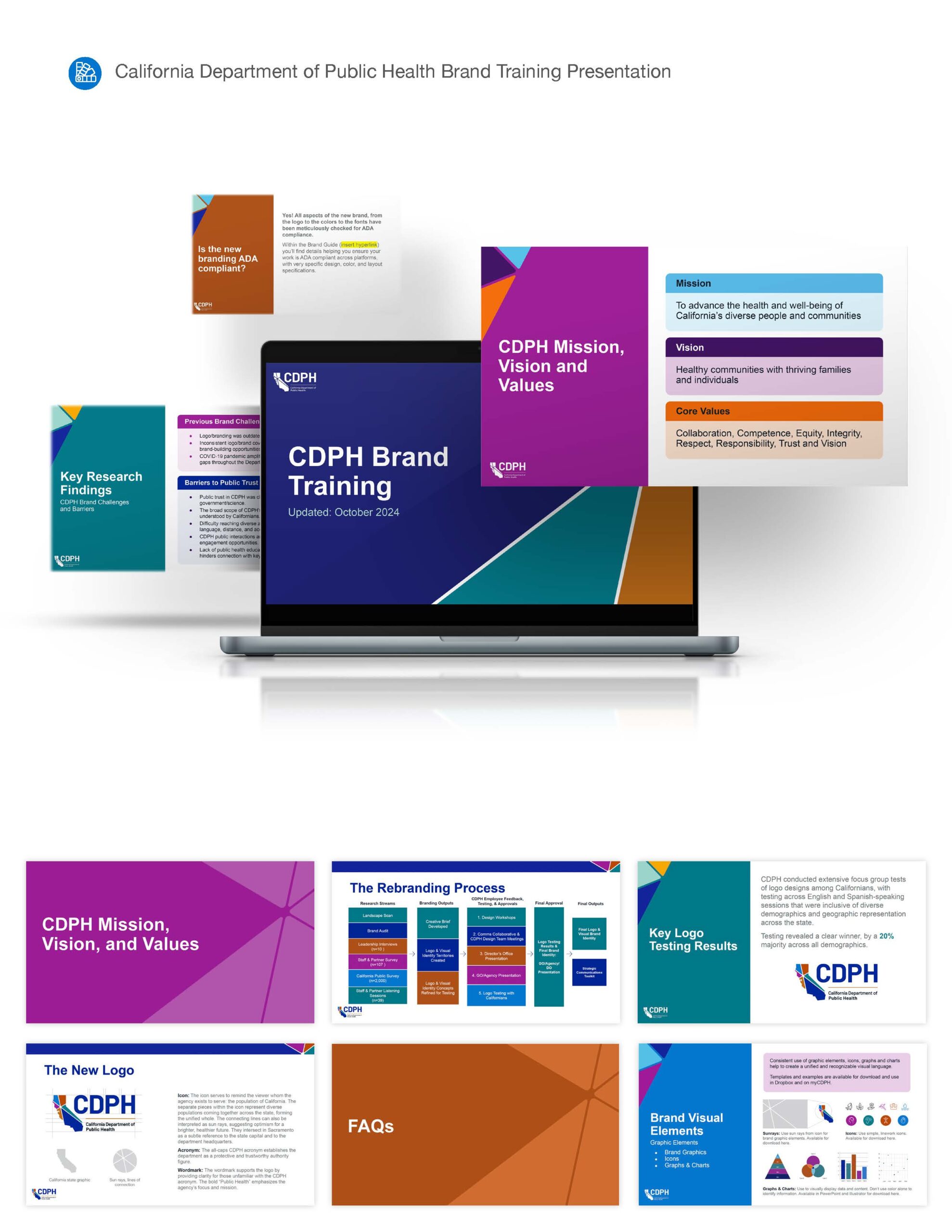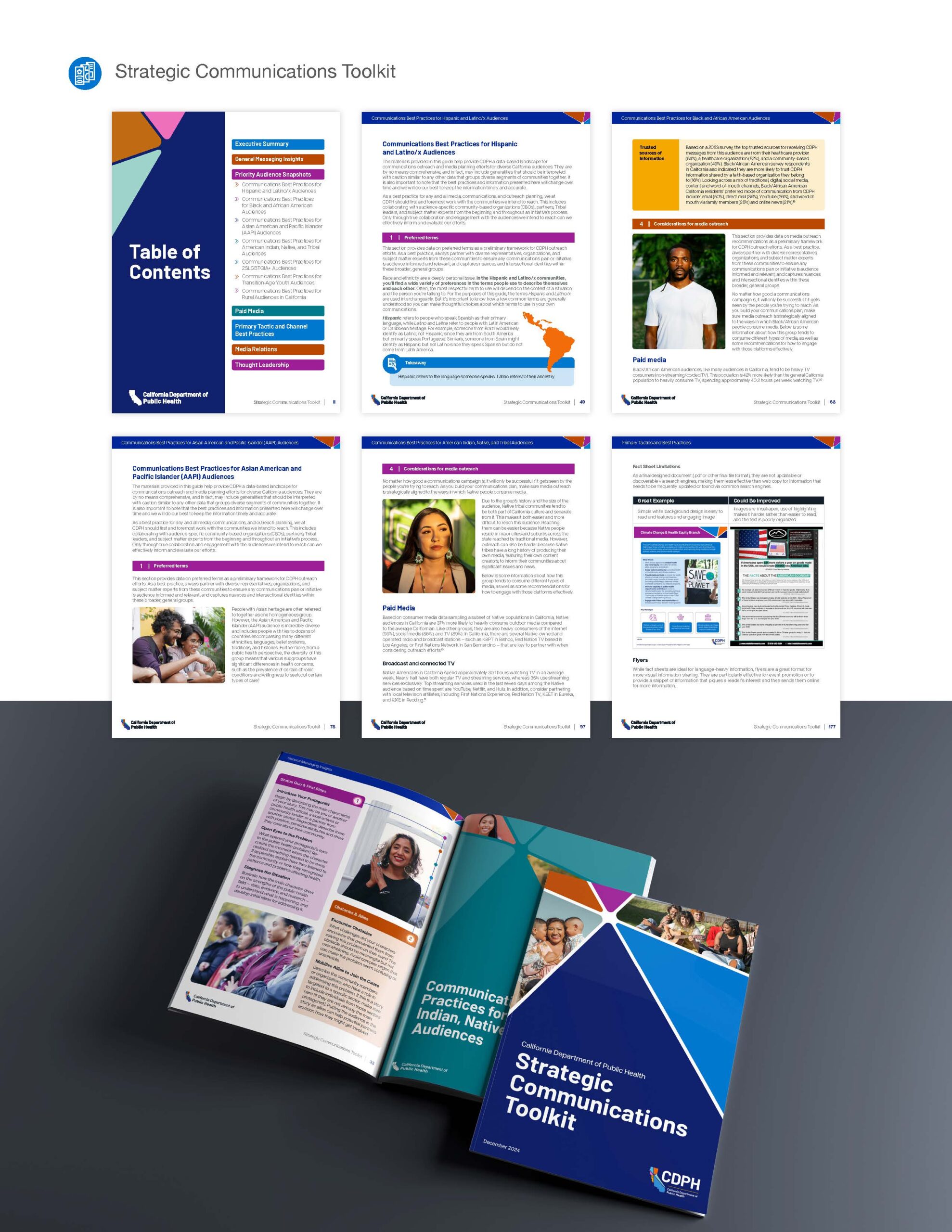 The rebrand was immediately praised for its clarity, cultural relevance, compelling visual representation of California’s diversity, and its deeply inclusive, audience-informed development process. The new brand helped staff, partners, and the public better understand and connect with CDPH’s work, enhanced internal alignment, and provided a strong foundation for rebuilding public trust. The ADA-compliant branding guidelines established a flexible and cohesive visual system, while the Strategic Communications Toolkit empowered staff and partners to communicate more effectively, consistently, and confidently across platforms. The rebrand was recognized with Gold awards for Campaign Branding by SMANA and for Branding Refresh by the Hermes Creative Awards, and was selected as a presentation at APHA 2025 and NPHIC 2025 for its success in building public trust through inclusive, research-informed design.